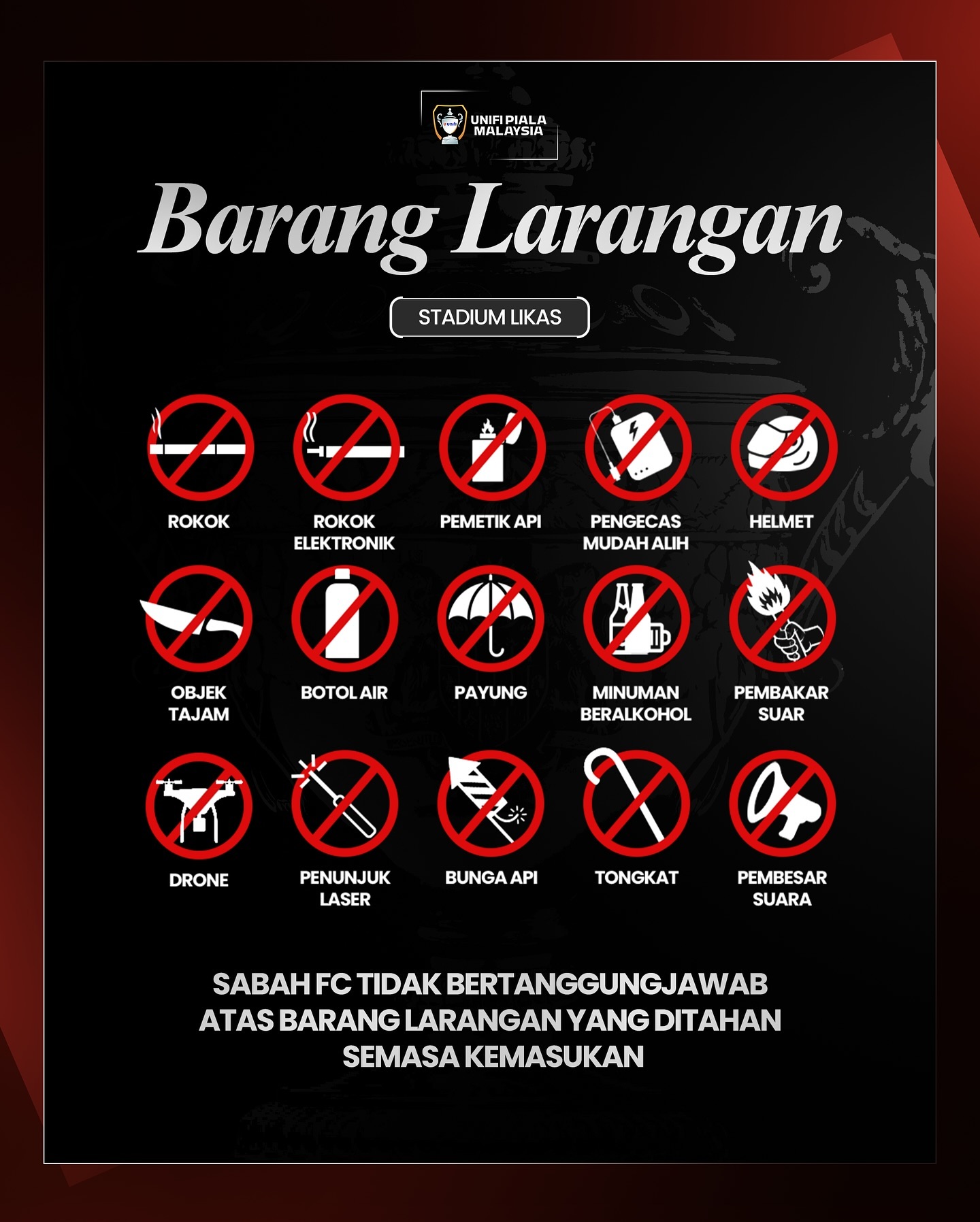 - The only permitted noise-producing instruments are drums and megaphones and must get approval from Sabah Football Club management. Persons or group wishing to bring in such items must obtain prior written consent to do so from Sabah Football Club management.